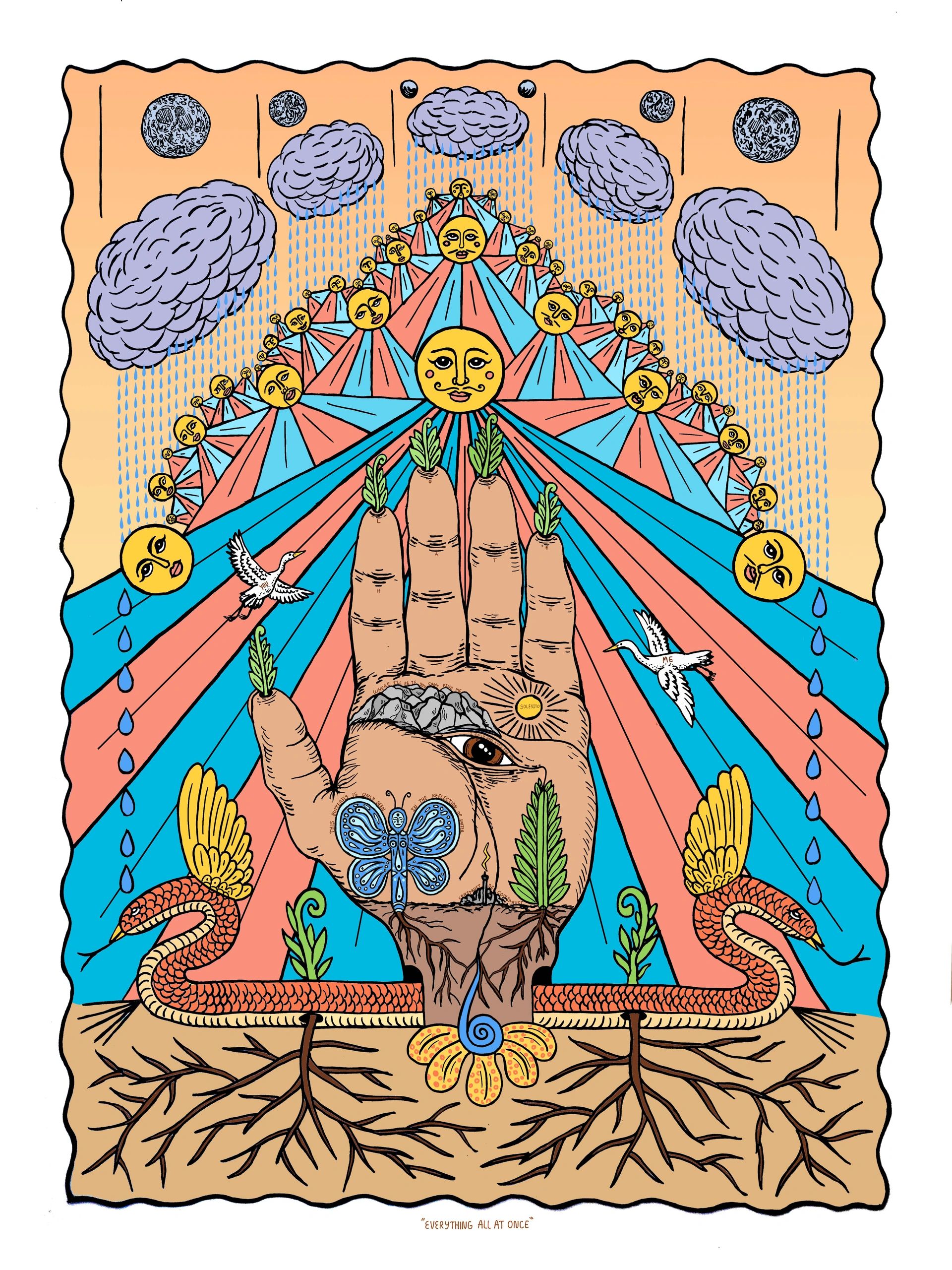 Jose Sotelo Yamasaki is a Texas based artist whose work moves freely across mediums, from paintings on glass and printmaking to illustration and mixed media. His practice explores symbolism, emotion, nature, and the strange possibilities that emerge when curiosity leads the way. His illustration work includes, a series of published Loteria inspired works in addition to collaborations with environmental and community-focused organizations.